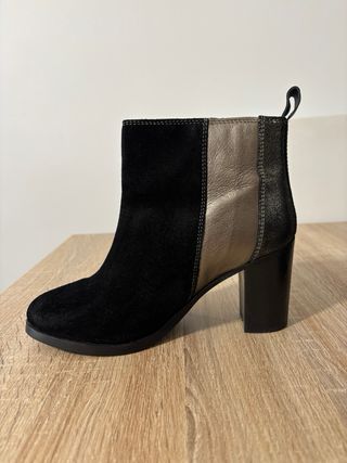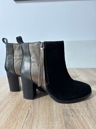 Botines de tacón con un diseño moderno y elegante. - Combinación de materiales en negro y plateado. - Cierre de cremallera lateral. - Detalle de tiradores en la parte superior. - Tacón grueso.
