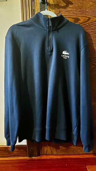 Jersey Lacoste azul con media cremallera. - Logo de Lacoste bordado en el pecho. - Cuello alto. - Puños y bajo elásticos.