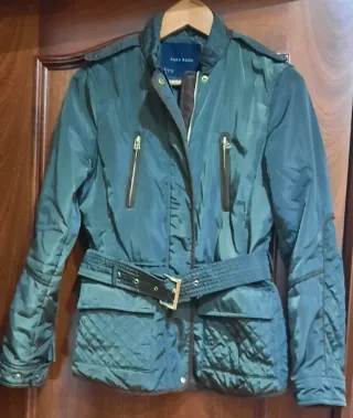 Cazadora de la marca Zara en color verde oliva. Presenta un diseño moderno y versátil. - Cinturón ajustable a la cintura. - Bolsillos frontales con cremallera. - Detalle acolchado en los bolsillos inferiores. - Cuello alto con cierre de cremallera.