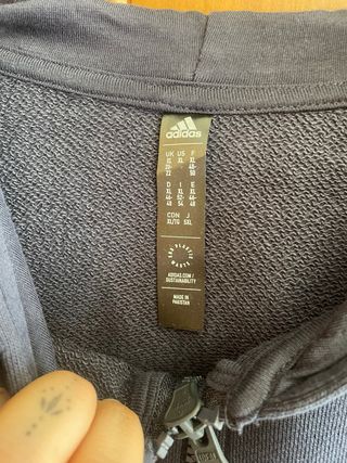 Chaqueta estilo sudadera de Adidas en color azul marino. Cuenta con el logo de la marca bordado en el pecho y las icónicas tres rayas en las mangas. - Cierre completo con cremallera. - Bolsillos frontales tipo canguro. - Capucha con cordones ajustables.