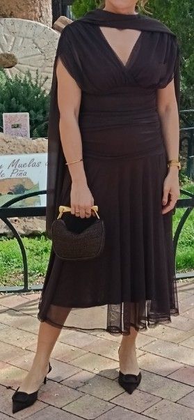 Vestido para evento de tul, en color marrón, color tendencia de la temporada, con capa en el mismo color, también disponible en beige. Nuevo, puesto sólo una vez.