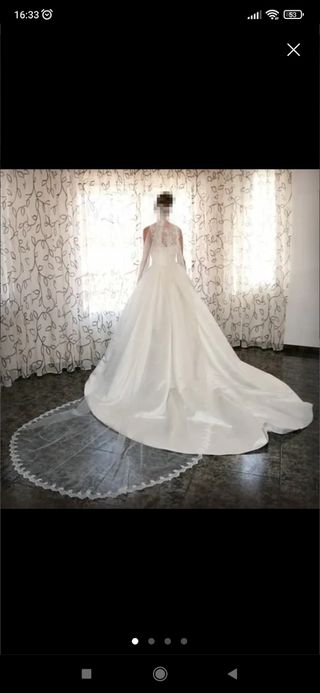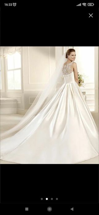 Vestido de novia de raso con encaje y larga cola, precioso, talla 36.