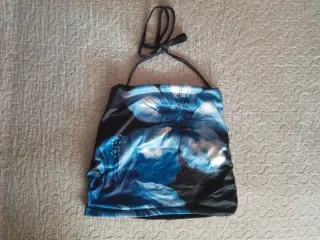 Preciosa camiseta de tirantes con estampado floral. Es de color azul marino y negro, con un diseño elegante y favorecedor. No la puedo devolver porque la página lo indica así y me queda fatal por la parte del pecho. SKU: sz25052716892123599 Medidas (según la web): -Largo: 47.1/23.5 cm -Pecho: 81.0 cm - Es de talla única. - Tiene un diseño de cuello halter. - La tela es suave y ligera.