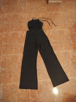Precioso mono negro, ideal para una ocasión especial. Es de un tejido suave y ligero. - Diseño halter. - Aberturas laterales a los costados. - Pantalón de tiro alto. - Corte amplio en las piernas.