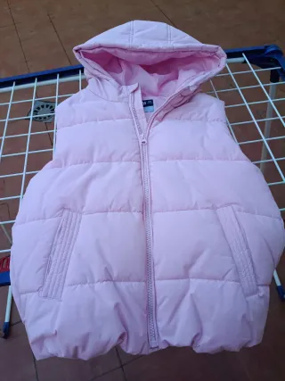 Chaleco acolchado con capucha para niña. Sin usar. - Cierre de cremallera frontal. - Bolsillos laterales. - Diseño sin mangas.