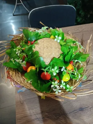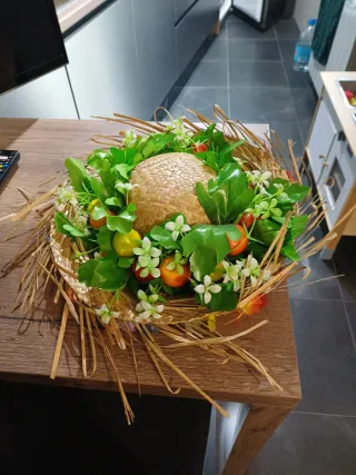 Bonito sombrero de paja decorado con elementos naturales. - Base de paja tejida. - Adornado con hojas verdes y flores blancas. - Incluye pequeñas frutas decorativas. - Ideal para los toros o ferias de pueblo.