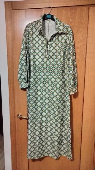 Vestido largo con estampado geométrico. - Diseño de cuello camisero. - Manga larga. - Cierre de botones en la parte superior.