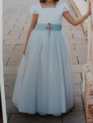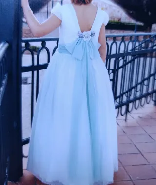 Vestido de comunión en talla 14. Un diseño elegante con detalles delicados. - Cuerpo blanco con mangas cortas. - Falda larga en tul color verde agua. - Cinturón de tela con lazada y detalle floral. - Espalda en pico.