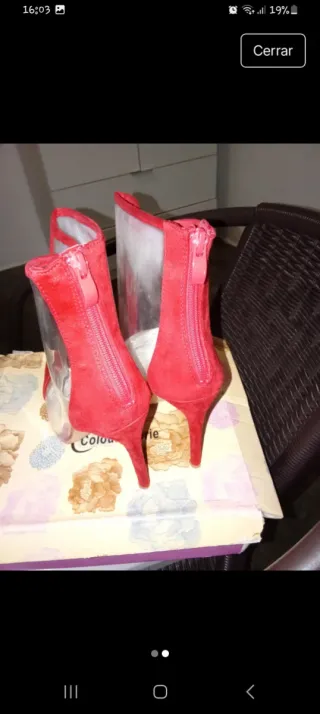 Botín de tacón con diseño transparente y detalles en color rojo. - Material exterior de ante. - Cierre de cremallera lateral.