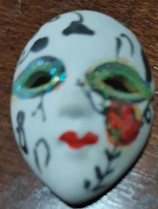 Este broche es una réplica de una máscara veneciana, con un diseño detallado y llamativo. - Diseño de máscara veneciana. - Detalles en purpurina verde y azul. - Labios pintados en rojo. - Dibujos florales y arabescos en negro.