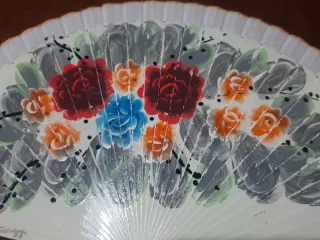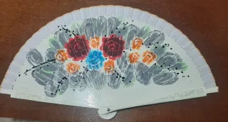 Abanico con un bonito diseño floral pintado a mano. - Pintura de flores en tonos rojos, naranjas y azules. - Detalles de hojas en gris y verde. - Puntos negros decorativos. Nuevo