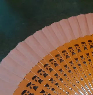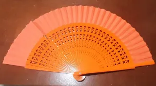 Abanico con un diseño calado. - Material: Madera y tela. - Color: Naranja.