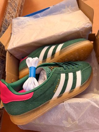 Zapatillas Adidas Gazelle en color verde con detalles en rosa. - Diseño clásico Gazelle. - Suela de goma. - Cordones blancos.