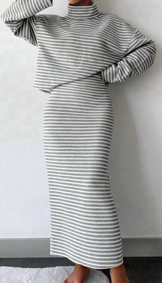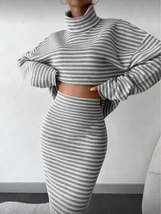 Conjunto de dos piezas a rayas. - Jersey de cuello alto. - Falda de tubo. - Diseño a rayas.