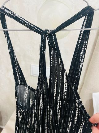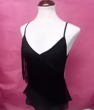 Top de mujer con un diseño moderno y atrevido. Mediadas axila-48 cm largo-62 cm - Tejido transparente en la parte superior. - Detalle de flecos en el pecho. - Tirantes finos.