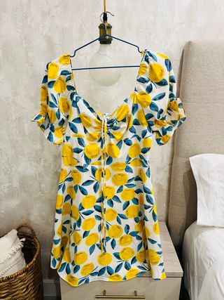 Vestido corto con un alegre estampado de limones y hojas azules sobre fondo blanco. Presenta un escote pronunciado con cordones ajustables y mangas cortas abullonadas. - Diseño con estampado de limones. - Escote con cordones. - Mangas abullonadas.