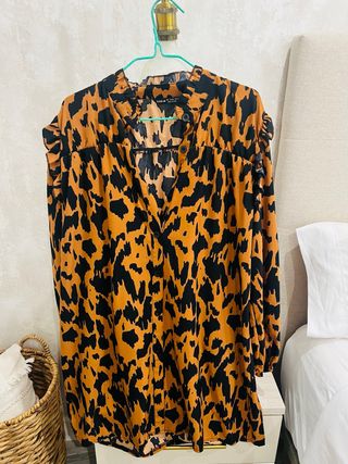 Vestido con estampado de animal print en tonos marrones y negros. Presenta un cuello con volantes y cierre de botones. - Mangas largas abullonadas. - Diseño con cuello mao y detalle de volantes.