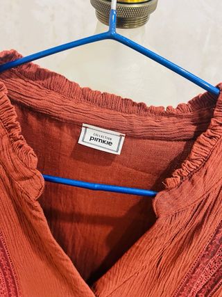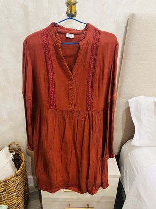 Vestido con un diseño de inspiración bohemia y detalles bordados. - Cuello mao con abertura de botones. - Mangas largas. - Tejido ligero y con textura. El color es como un teja, es más apagado de lo que en realidad se ve en la foto. La talla no sabría decirla porque no tiene la etiqueta, pero debe ser una L