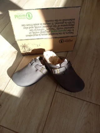 Sin estrenar zueco de piel talla 36 marca Natural World, forrados. Descripcion detallada en foto. Los vendo debido a lesion grave por tallaje.