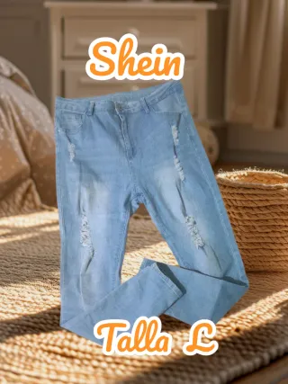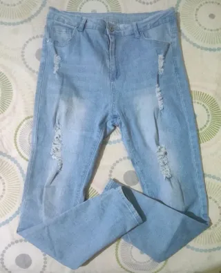 Color azul claro, con rotos y efecto desgastado. Muy buen estado, lo único una pequeña manchita que se puede ver en una de las fotos. Ver fotos con etiqueta y medidas. Para más información preguntar sin compromiso. Precio si es entrega en mano. Para envíos puedo rebajar algo.