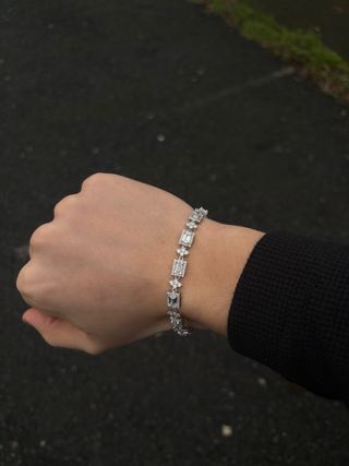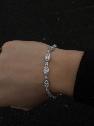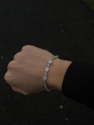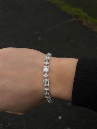 Elegante pulsera con un diseño brillante y sofisticado. - Acabado en plata. - Detalles con incrustaciones brillantes. - Diseño de eslabones con piedras.