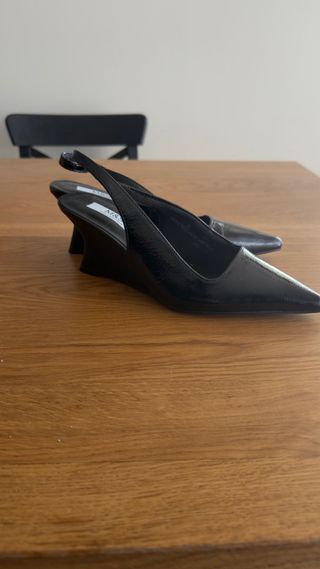 Elegantes tacones de Marks & Spencer con un diseño de punta fina y tira trasera. - Tacón de cuña. - Acabado brillante. - Tira ajustable al tobillo.