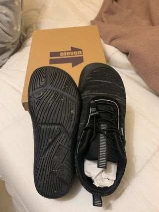 Zapatillas deportivas Eleven en color negro y gris. - Cierre con cordones elásticos. - Detalle de tejido jaspeado. - Tirador trasero para facilitar el calce. Nuevas, sólo se han usado un par de veces por casa, no han pisado la calle. Costaron 39€