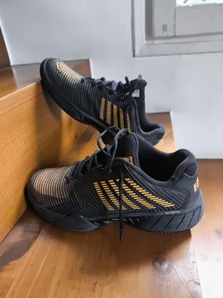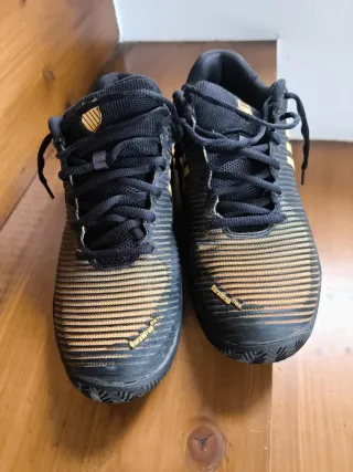 Zapatillas K-Swiss para hombre, con un diseño moderno en negro y detalles dorados. Han sido usadas solo en tres ocasiones, por lo que se encuentran en excelente estado. - Diseño deportivo. - Combinación de colores negro y dorado. Las nuevas cuestan 150€