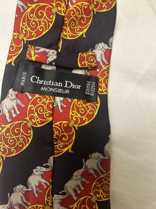 Elegante corbata de seda Christian Dior Monsieur. - Diseño con elefantes y motivos ornamentales. - Fabricada en Francia.