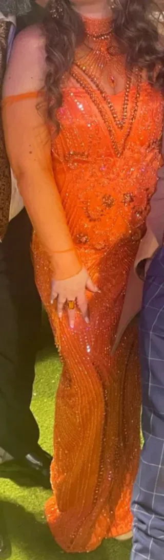 Vestido largo de pedrería en color naranja, ideal para bodas o eventos especiales. - Diseño con escote pronunciado y manga larga. - Adornado con múltiples abalorios y pedrería. - Corte sirena que realza la figura.
