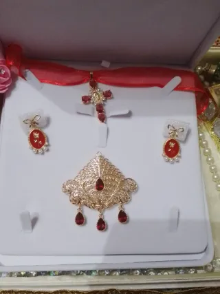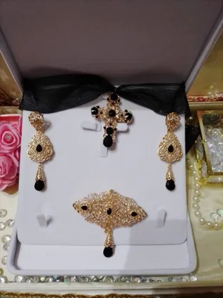 Conjunto de aderezo fallero para adulta, con un diseño elegante y detallado. Gargantilla con cinta de seda con toque brillo puede cambiar el color que mejor le vaya. - Pieza central con motivos ornamentales. - Pendientes a juego. - Colgante con forma de cruz adornado con pequeñas piedras.