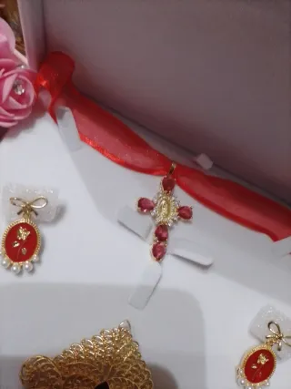 Conjunto de aderezo fallero para niña, con un diseño elegante y detalles en pedrería. Gargantilla con cinta de seda y cruz con Virgen. Pendientes de clip que no hace daño. Niñas pequeñas. - Elaborado en metal dorado. - Adornado con piedras rojas.