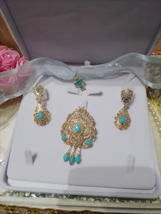 Conjunto de aderezo fallero para niña, con un diseño elegante y detalles en turquesa. Con cinta de organza. - Pendientes a juego. - Broche central. - Colgante con varias piezas. - Acabado dorado.