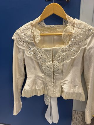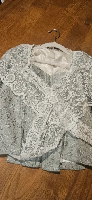 Corpiño de fallera para niña con un diseño elegante y detalles de encaje. - Tejido texturizado en tono grisáceo/verde. - Adornos de encaje blanco en cuello y mangas.Incluye peinador - Cierre frontal. Para 12/13 años...medidas en fotos