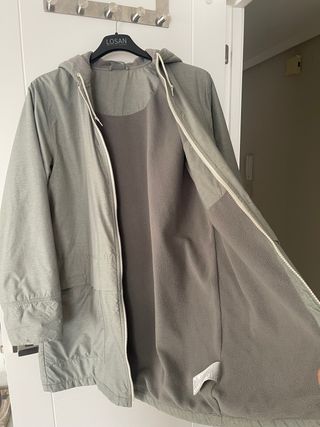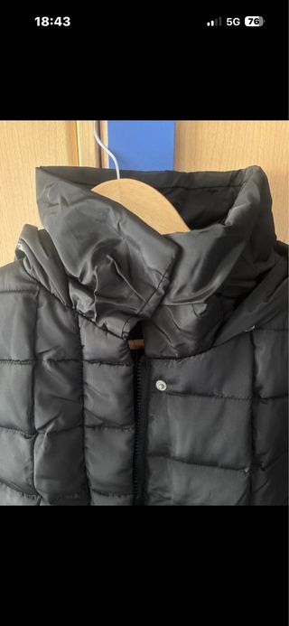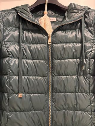 Plumífero acolchado de color verde con capucha. Es plumón, fino per abriga mucho. Puesto 2 veces. - Cierre de cremallera frontal. - Cordones ajustables en la capucha. - Bolsillos laterales.