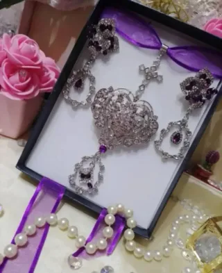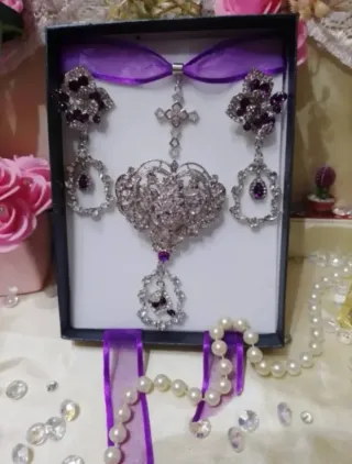 Conjunto de aderezo fallera, huertana, fiestas regionales, etc. - Diseño intrincado con detalles plateados. - Acentos en tono morado. - Incluye pendientes, broche y colgante.