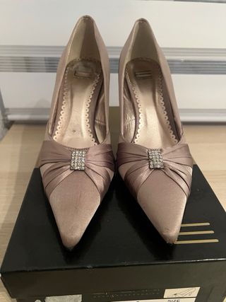 Elegante conjunto de zapatos de tacón y bolso de mano a juego, confeccionados en raso color visón. El diseño del zapato presenta un detalle de pedrería en la punta y el bolso un lazo decorativo con la misma pedrería. - Material: Raso. - Color: Visón. - Adorno: Pedrería.
