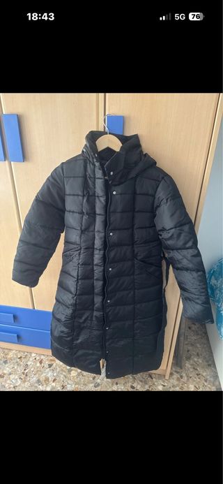 Plumífero largo de color negro, ideal para el frío. - Diseño acolchado. - Capucha integrada. - Cierre de botones a presión.