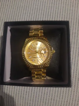 Elegante reloj chapado en oro con un diseño distintivo en la esfera. - Esfera con patrón de rayas. - Bisel estriado. - Brazalete de eslabones. - Pone el dia en que estamos