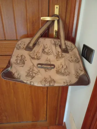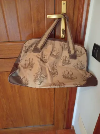 Práctica bolsa de viaje con un diseño original de barcos de vela. - Estampado detallado de barcos en tonos beige y marrón. - Ribetes y asas en piel sintética marrón. - Ideal para escapadas cortas o como equipaje de mano.
