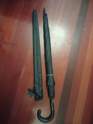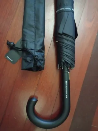 Paraguas plegable de color negro, ideal para protegerte de la lluvia. - Mango curvo para un agarre cómodo. - Incluye funda protectora.