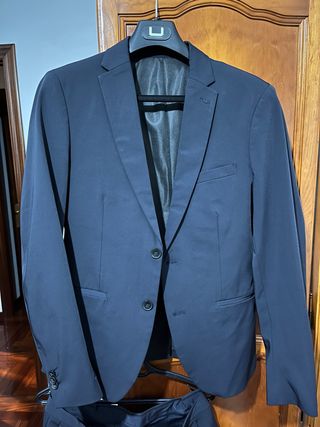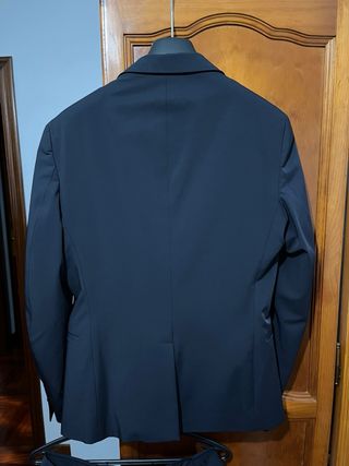 Traje de chaqueta y pantalón de color azul marino. - Chaqueta de corte moderno. - Cierre de dos botones. - Bolsillo de ojal en el pecho. - Bolsillos laterales con solapa. - Puño con tres botones. La talla de la chaqueta es la 46 y la del pantalón la 42 (el pantalón está cogido el bajo para que quede a la altura del tobillo)