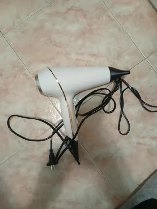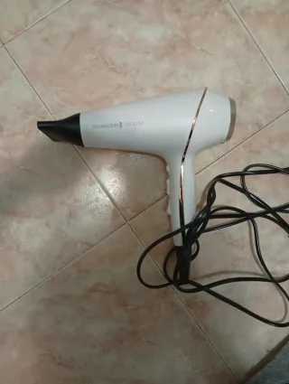 Secador de cabello Remington con un diseño elegante. - Color blanco con detalles dorados. - Boquilla concentradora. - Mango ergonómico.