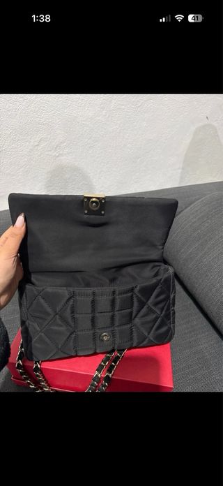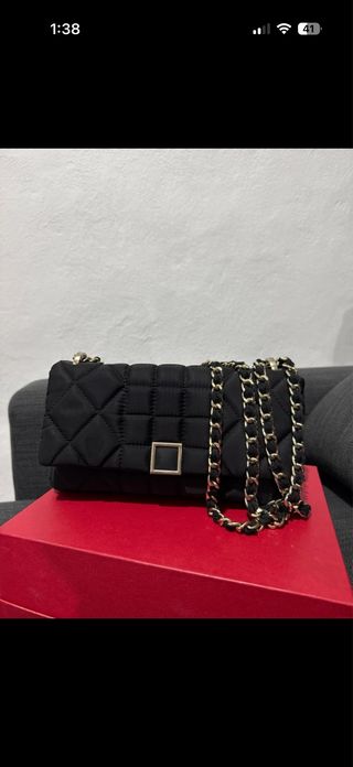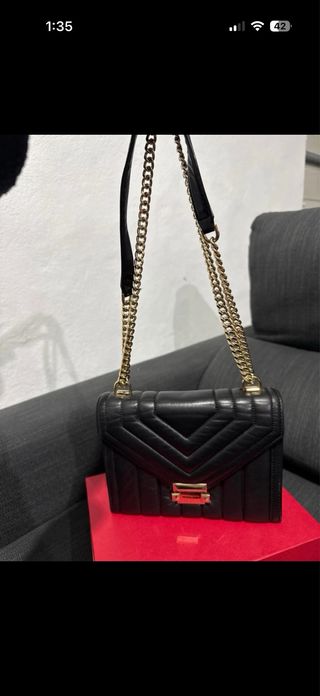 Elegante bolso de piel con diseño acolchado en forma de V y detalles dorados. - Cierre de solapa con broche metálico. - Asa de cadena. - Compartimento principal. Tiene un rascacito dentro que no se ve, y fuera de abrirlo donde esta el broche tiene alguna marca del uso, pero esta perfecto, muy cuidado.