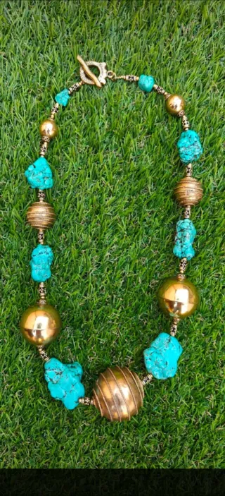 Elegante collar de la marca Alcozer & J, con un diseño único que combina tonos dorados y turquesas. Alcozer & J es una empresa artesanal, especializada en la creación y producción de joyas de lujo, nacida en Florencia en 1994 del sueño de su fundador y diseñador Giampiero Alcozer. - Piezas de turquesa natural. - Cuentas doradas de gran tamaño y detalle. - Cierre de tipo T-bar.