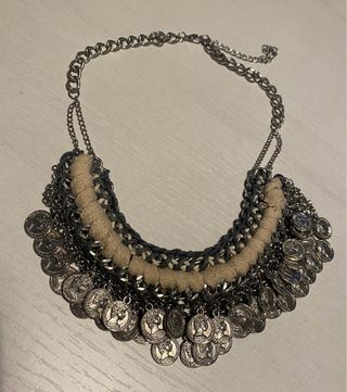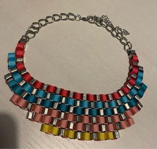 Este collar es un accesorio vibrante y llamativo. - Diseño con varias filas de cintas de colores. - Detalles metálicos entre las cintas. - Cadena plateada para ajustar el largo.