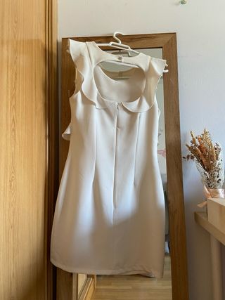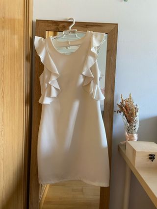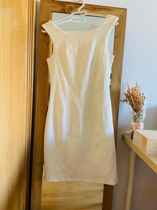 Elegante vestido de corte recto con un diseño de espalda con abertura y volantes discretos en laterales. Tejido de calidad, forrado. Talla M.