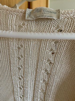 Chaqueta de punto fino de perlé, color hueso, nueva y de calidad, con un diseño delicado y elegante. - Manga larga. - Acabado con puntilla en el bajo y puños. - Detalle de aberturas caladas en el tejido.