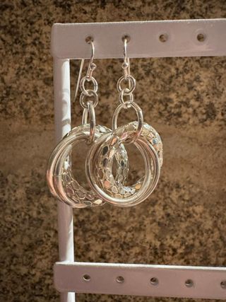 Elegantes pendientes plateados con un diseño único. - Cierre de anzuelo seguro. - Diseño de eslabones entrelazados. - Acabado brillante. Funda de cojín con un diseño vibrante y llamativo.