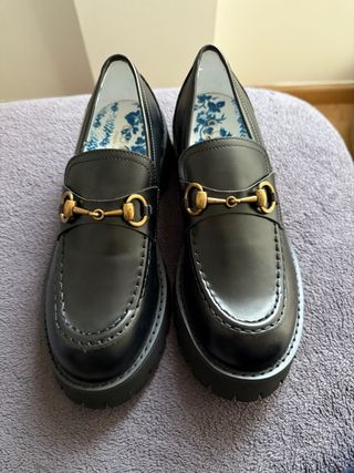 Mocasines negros con detalle de hebilla dorada. - Diseño clásico y elegante. - Suela gruesa y resistente. - Interior con estampado floral. SON FAKES, pero están nuevos sin usar porque no son de mi talla, y los vendo al precio que los compré